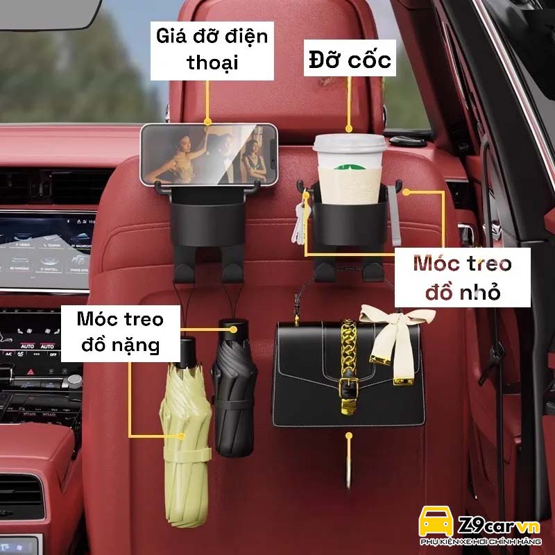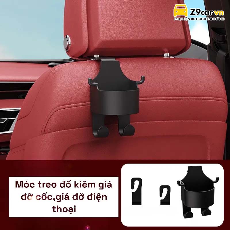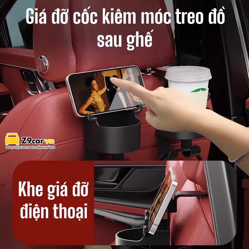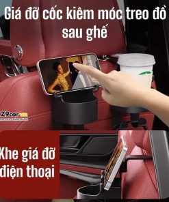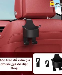 Móc treo đồ kèm giá cốc ghế sau 3in1. Có thể dùng treo, để cốc và đặt điện thoại vô cùng tiện dụng.